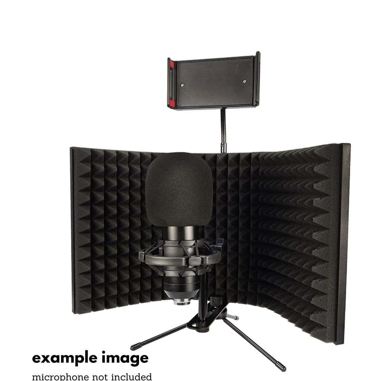 This nifty compact isolation shield reflection filter is ideal for providing critical isolation for recording mics, especially for spoken or sung vocals. The clever design of this unit provides a smartphone holder at the top, useful for access to lyrics.