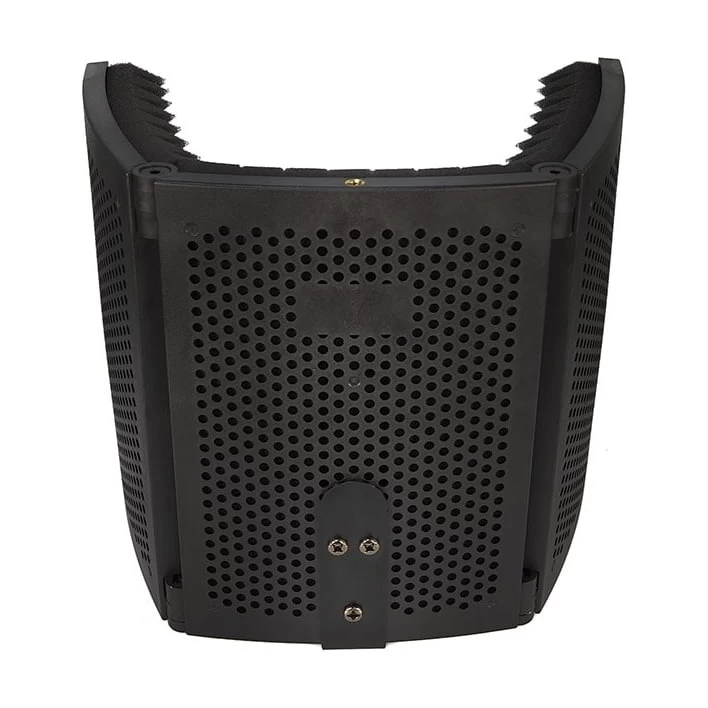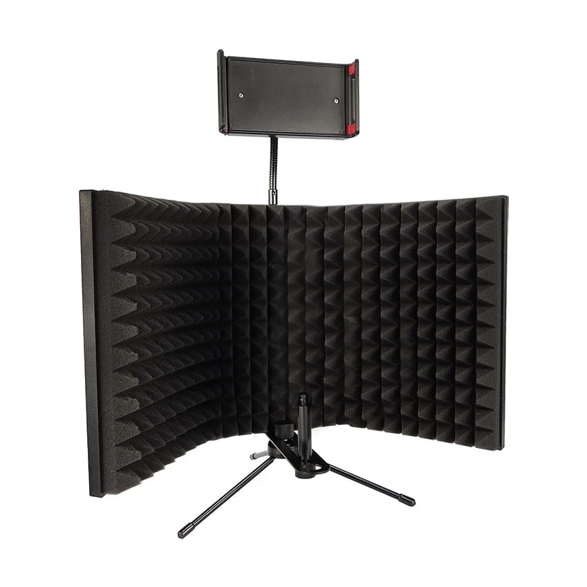 It is easy to adjust the recording area depending on the situation as the 2 side panels are foldable. Pyramid shaped professional sound-absorptive foam reduces sound echo and maximises diffusion. The microphone mounting bracket is designed such that it can be moved forward or backward for the preferred signal. Surrounding the microphone more will reduce the ambient reverb in the recording, while pulling it away from the mic will let in more ambient reverb. This allows you to achieve the perfect balance suited to your room. The addition of a smartphone holder provides a method to display lyrics, or even to stream your performance!