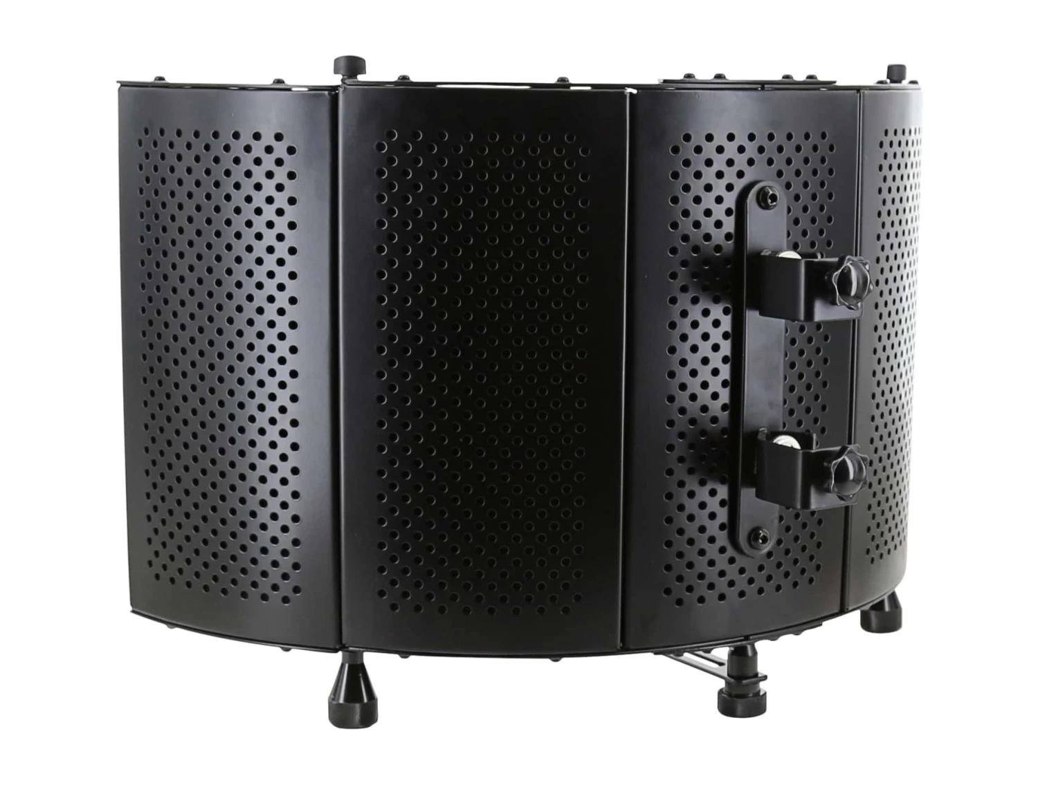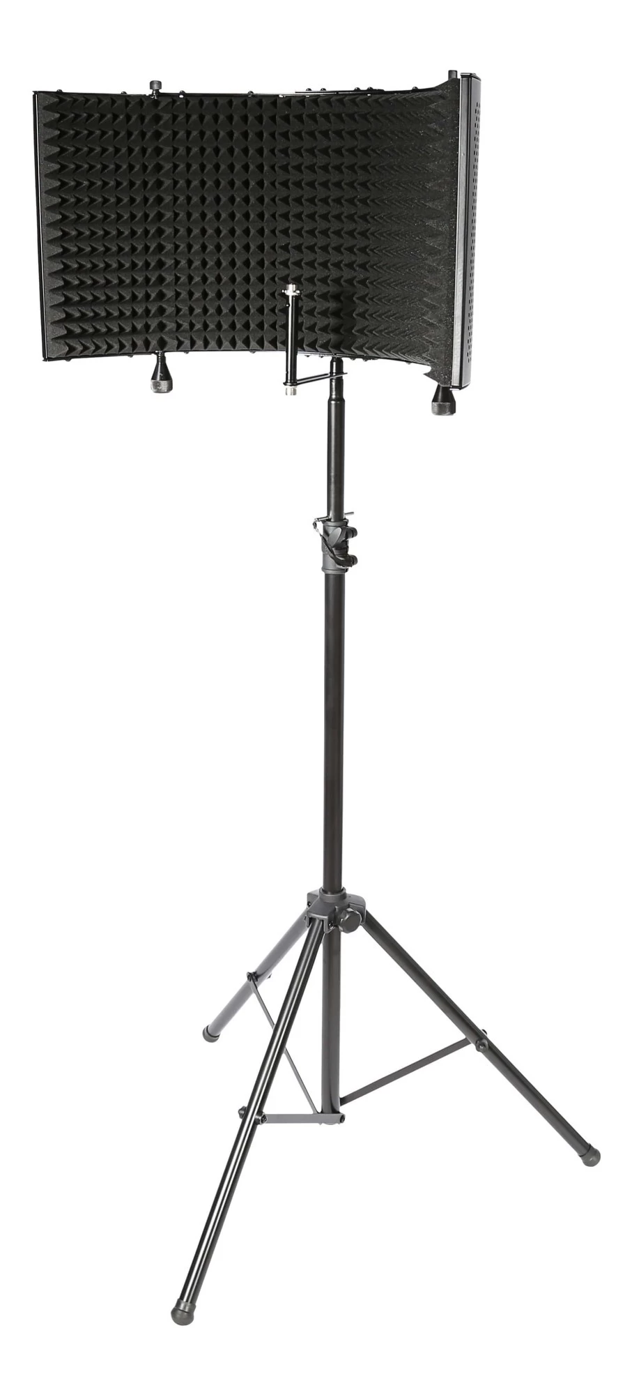 It is easy to adjust the recording area depending on the situation as the 2 side panels are foldable. Pyramid shaped professional sound-absorptive foam reduces sound echo and maximises diffusion. The booth can be mounted on any standard mic stand with a tripod base. The microphone mounting bracket is designed such that it can be moved forward or backward for the preferred signal. Surrounding the microphone more will reduce the ambient reverb in the recording, while pulling it away from the mic will let in more ambient reverb. This allows you to achieve the perfect balance suited to your room.