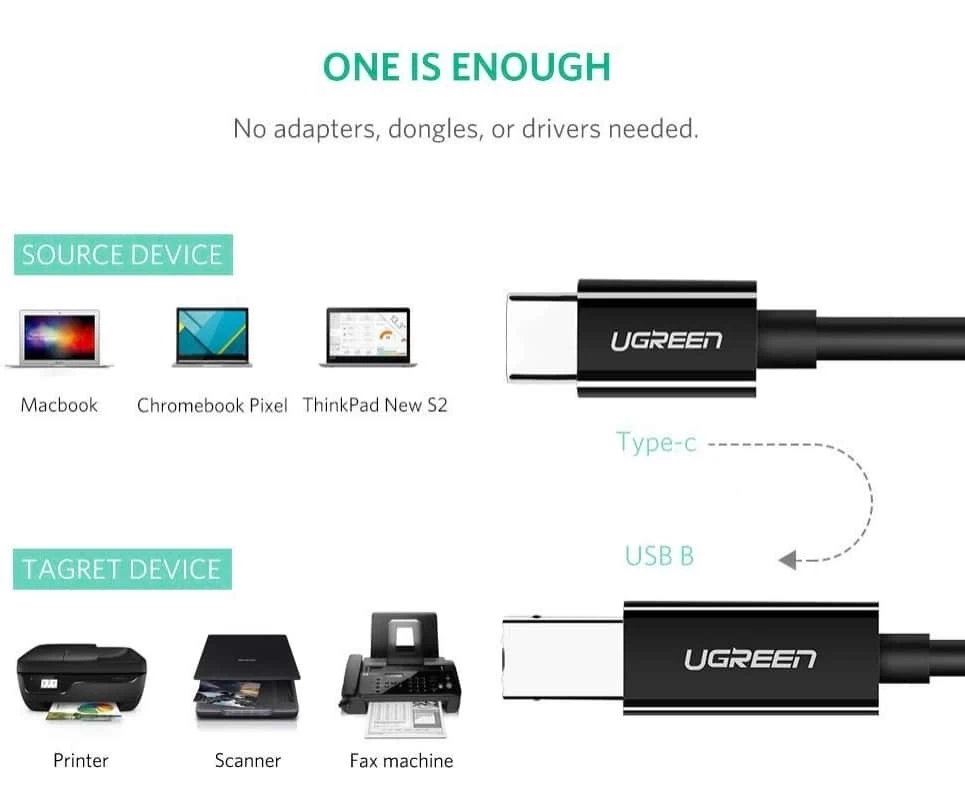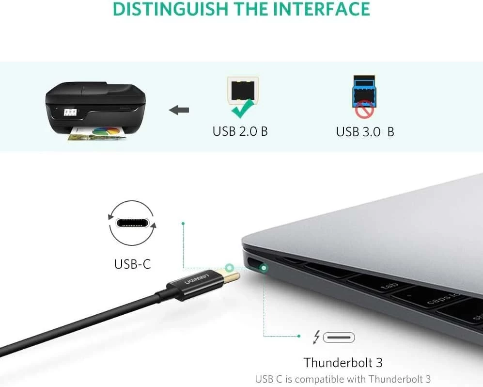 The Ugreen 50446 printer cable is an ideal choice for connecting MacBook to a printer, scanner, printer switch or even external hard drive with USB 2.0 Type B interface. Work perfectly with a common printer or scanner with USB-B 2.0 port.