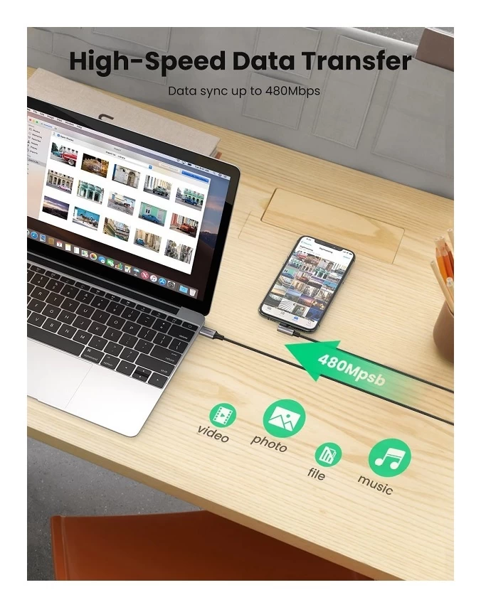 The UGREEN 60763 delivers a high-speed charge up to 3A (max) with the USB-C PD charger, to charge an iPhone from 0% to 50% in 30 mins. The data transfer rates up to 480Mbps. 1G large files will be finished in 25s. With the L design it is much more convenient and more comfortable for playing games, watching videos, reading e-books when you lie on the couch or bed while charging.