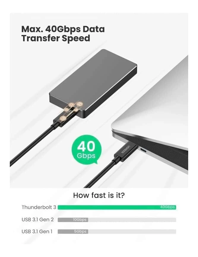 The UGREEN 80324 100W thunderbolt 3 cable (USB C TO USB C) can support 40Gbps data transmission, 5K high-resolution video output, and 100W power delivery charging, one cable to meet all your needs. It will support rapid charging up to 100W at 20V/5A max. This is 4X faster than USB 3.1 Gen 2. Transfer huge audio and video files in seconds.