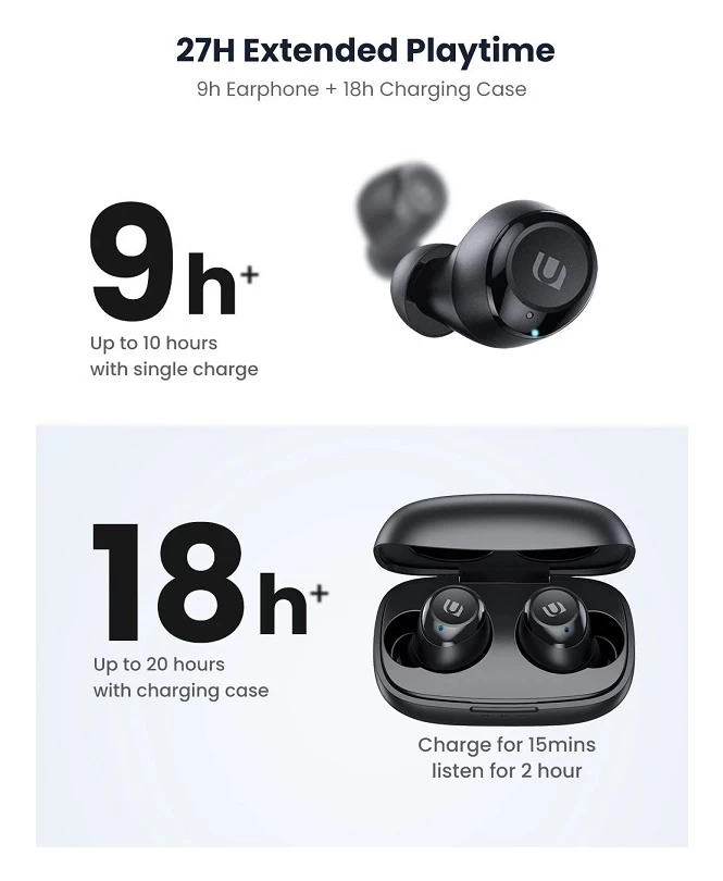 UGREEN HiTune earbuds offers a 9h playtime from a single charge and an extra 18h with the portable charging case for a total of 27h+ listening. The USB-C quick charge enables 2 hours of full charge for the charging case and 15mins charging for the earbuds that will allow 2 hours listening.