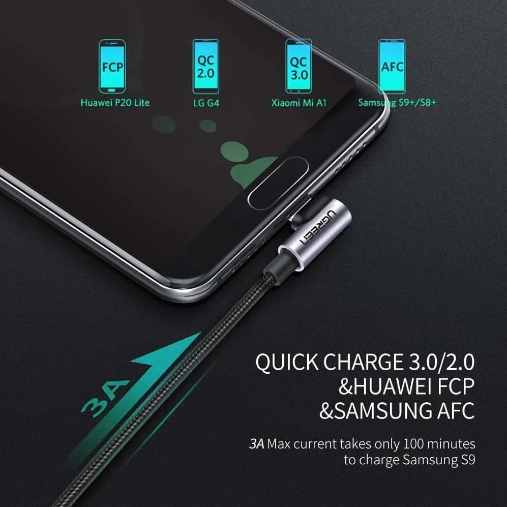 This UGREEN Series of 90 Degree Right Angle USB-C to USB-A charging cable has an innovative 90 degrees L design, designed to reduce wear and tear on the cable and on your Type-C smartphones and tablets. Especially ideal for limited spaces. Fast charging.
