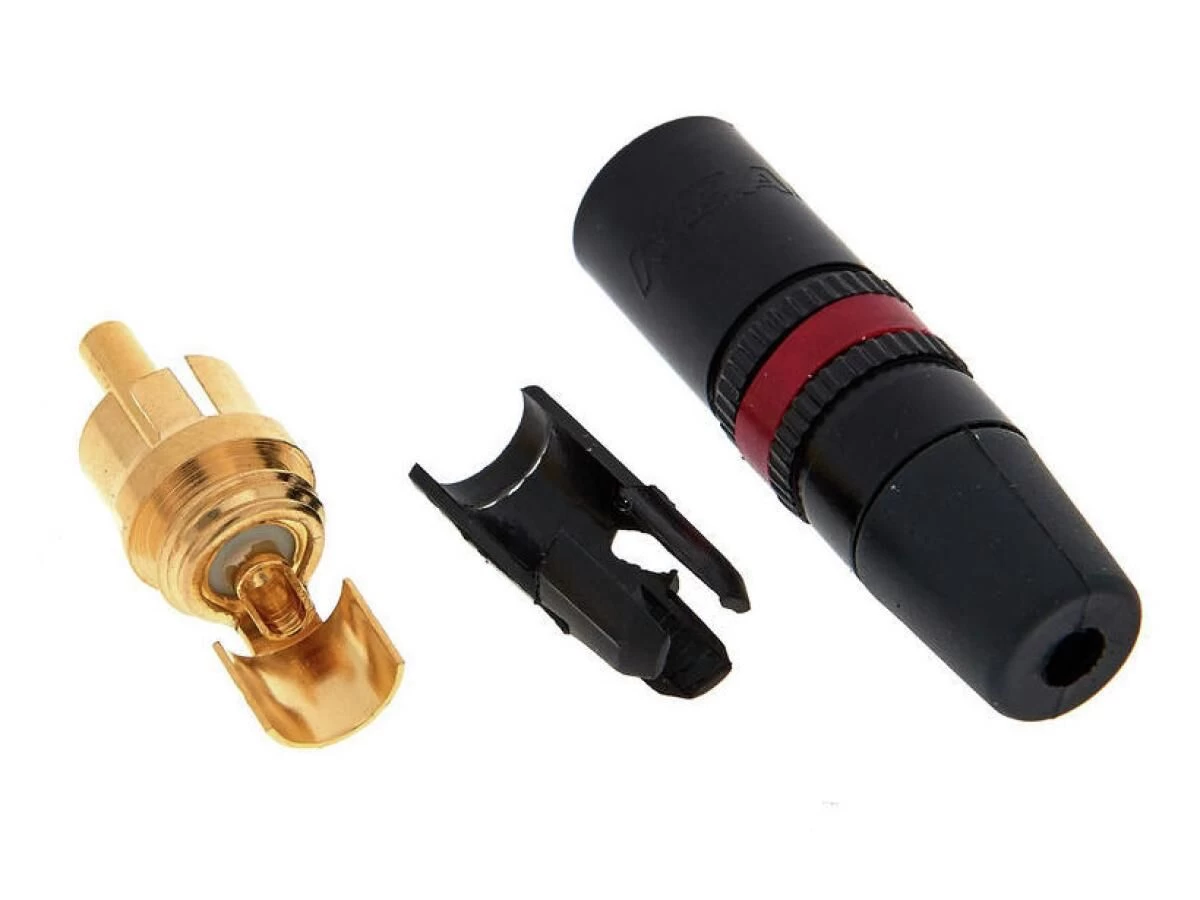 This is a single male RCA connector used to transfer a mono or unbalanced signal through an audio cable. Often used to terminate RCA leads.