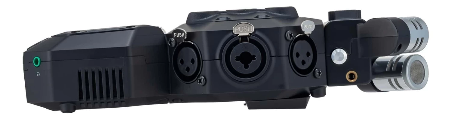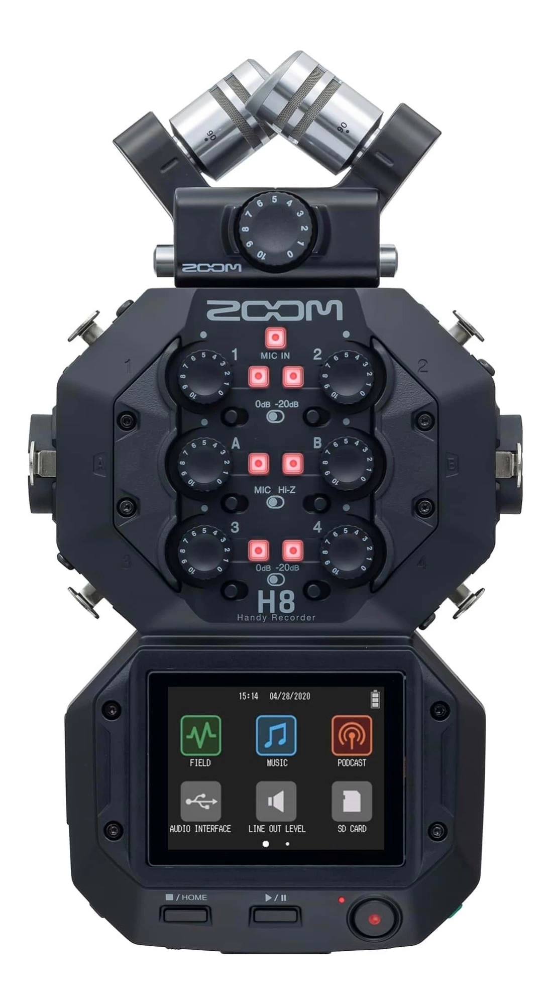 The Zoom H8 handy recorder is designed to meet all your audio recording needs. 12 simultaneous recording tracks, interchangeable capsules, and an App-driven touchscreen interface. H8 can capture high-quality audio from almost any source. The H8 comes with the Zoom XYH-6 microphone. This capsule provides two matched high-quality unidirectional mics, for capturing signal directly in front of the recorder. With the Zoom mic capsule system you can easily swap capsules to ensure you’re always using the right mic for the job. The H8 offers 4 XLR inputs with dedicated pad switches and gain control. 2 additional XLR/TRS combo jacks with Hi-Z switches allow you to capture line level signals, microphones, or directly record electric guitars and basses. Monitor tracks using the built-in 1/8” headphone output or connect directly to your camera using the dedicated stereo line output.