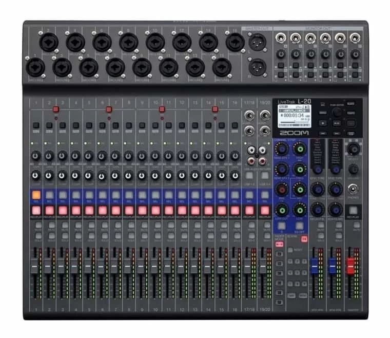 Zoom’s LiveTrak L-20 makes capturing a rehearsal, producing a quick demo, or creating a great-sounding concert recording easy. Not only can you record up to 22 individual channels, but you can also create custom headphone mixes for up to six band members and craft a polished live mix complete with studio-quality effects. You can complete your entire project on the L-20 or transfer all 20 discrete tracks to your DAW for editing and mixing. The LiveTrak L-20 also functions admirably as a 22-in/4-out USB audio interface for your Mac, PC, or iOS device.