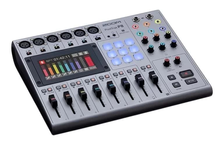 The Zoom PodTrak P8 is a portable multitrack podcast recorder that lets you quickly record up to six mics, handle 2 echo-free remote call-ins simultaneously, trigger sound samples, and provide separate headphone feeds for all your guests, all at the same time and with refreshing simplicity, thanks to the large full-color LCD touchscreen.