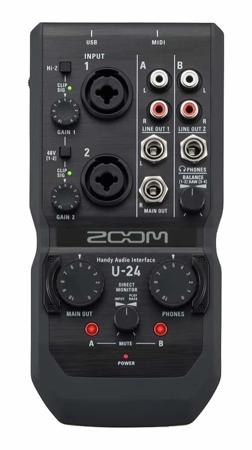 The U-24 features two high-performance, low-noise mic preamp—the same as our acclaimed H6 Handy Recorders—with less than -120 dBu EIN, as well as recording and playback at resolutions up to 24-bit/96 kHz. You can also use the U-24 as a studio-quality headphone amp and listen to your favorite music in full fidelity. Two combo inputs with independent gain knobs and multi-color level indicators allow you to connect mics, keyboards, mixers, and more. 48V phantom power can be supplied to both inputs, and input 1 supports Hi-Z for connecting guitars, basses, or other passive instruments. MIDI input and output jacks allow you to use devices like keyboards, controllers, synthesizers, and drum machines. Separate TRS and RCA output jacks provide multiple options for connecting DJ mixers, monitors, and other gear. Finally, an independent headphone output with dedicated volume control gives you complete flexibility while monitoring.